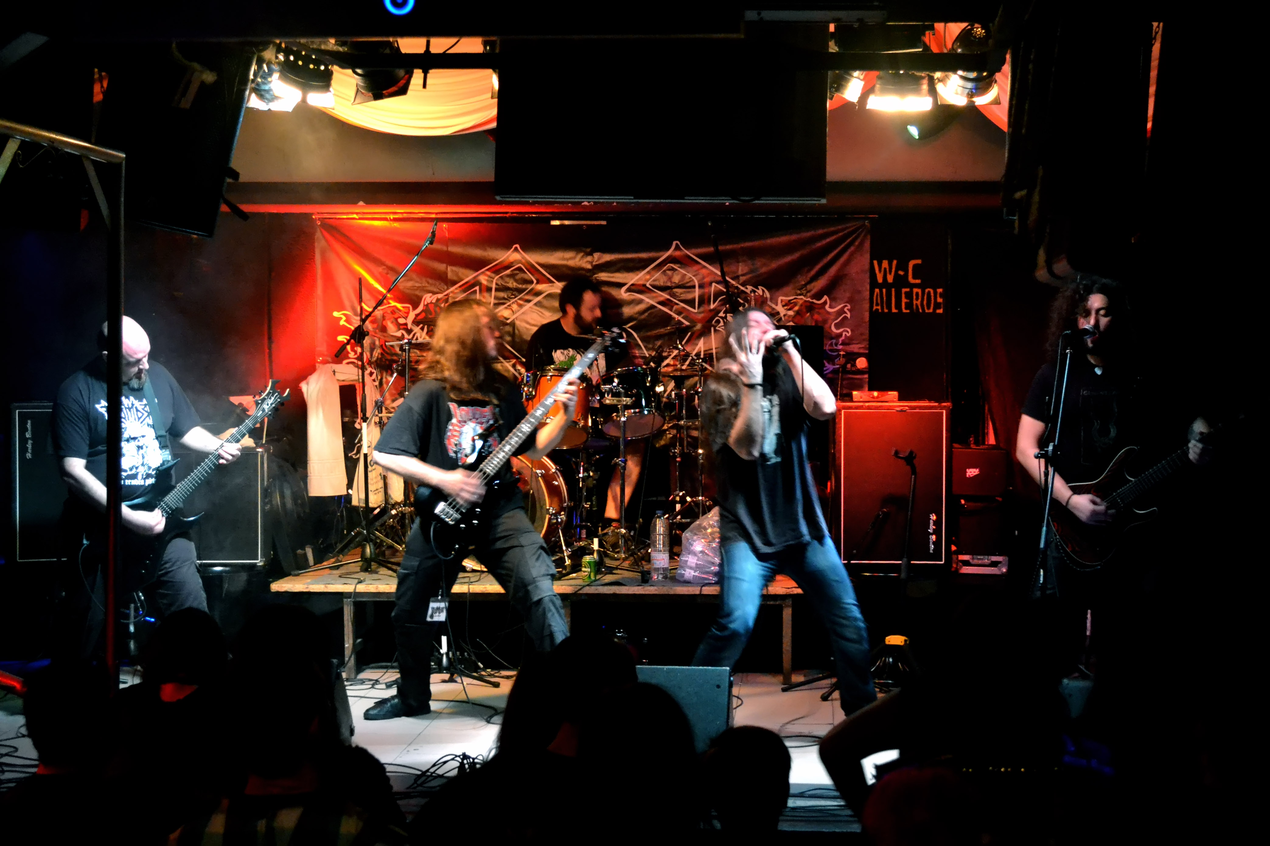 La primera banda en aparecer sobre las tablas de la mítica sala Excálibur (aunque mejor omito mi opinión del nombre que leí en los carteles de fuera…) en el madrileño barrio de Vallecas fue TROMORT. Llegamos con el concierto recién empezado y nos sorprende un bloque sónico que noquea a todo el que se ponga frente a estos cinco animales. Con un death metal muy pesado y rápido, caen los temas sin piedad para los presentes. Su vocalista, bailaba literalmente sobre el escenario tan ancho, como si sonara una canción folklórica, en vez de la matanza que realmente estaban haciendo. La banda se mostró muy coordinada tanto en sonido como ejecución y muy activa durante todo el show, incluidos headbanging brutales.